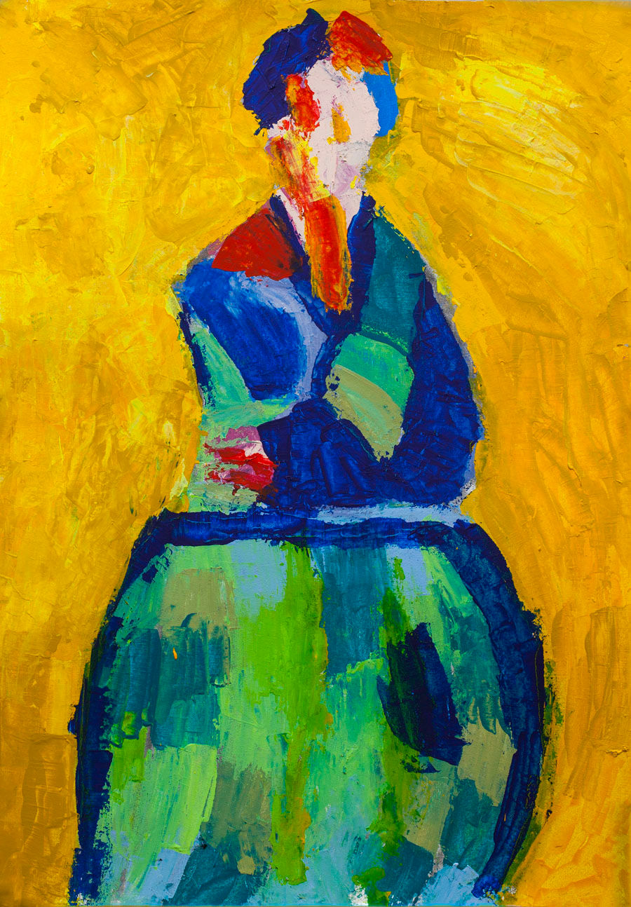 The idea for this painting came when I had a regular painting lesson. Umeda entered the studio, wearing a large green-turquoise-blue checked bathrobe and a towel over her head. Illuminated by the bright sun, her outfit burned with fabulous colors, and my art teacher exclaimed: “Medina, quickly take a picture of Umeda, you should paint her.” And I immediately started working on the portrait: I chose the size for a long time, selected the right colors - during this period I painted with acrylic. I highlighted the reflections of the sun that fell on Umeda's face and clothes with orange and red tones. The background of the picture shimmers with different shades of yellow - this color gives me a feeling of warmth, something very dear, homely.